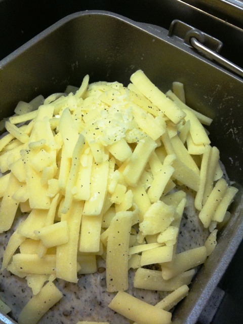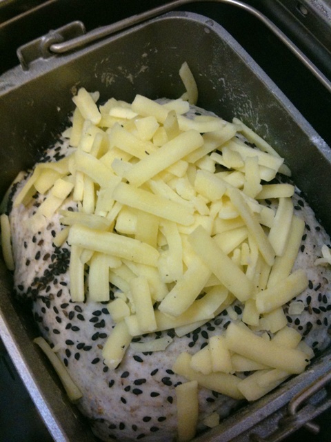 生地にゴマを入れ、あたまにチーズをかけて焼くことに。