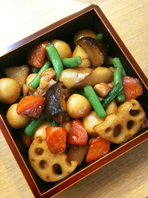 今年の正月に購入した小さな重箱をつかって「なんちゃっておせち」を。
