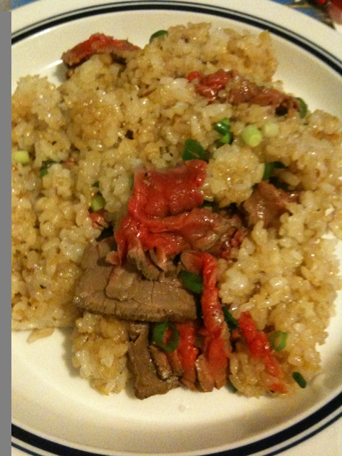 昨日作った牛肉のたたきを使って、「牛肉のたたき入りガーリックライス」を作る。