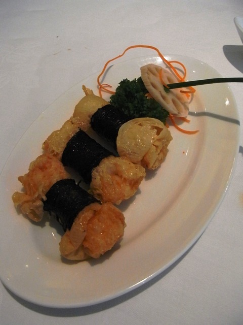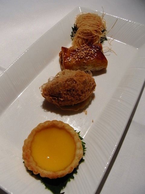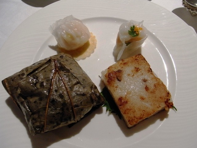 上右)点心3種。とても凝ったつくり。おいしい。それぞれタレが裏側に塗ってある。