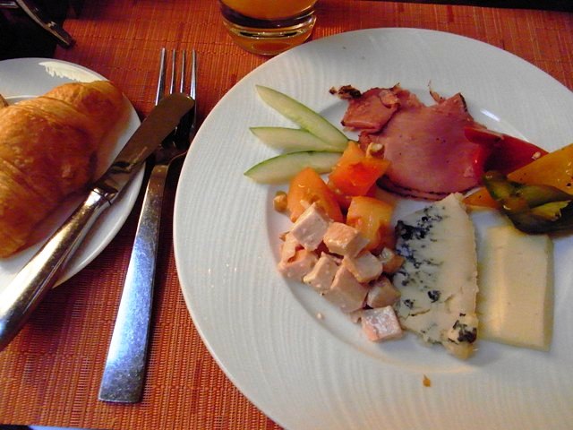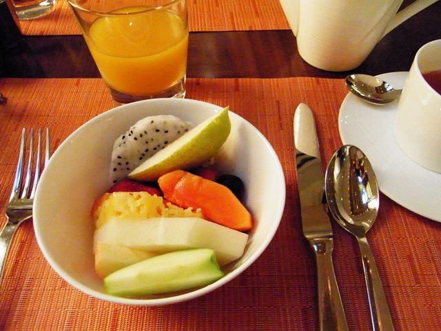 左)フルーツはまあまあ。パパイアとメロンはおいしい。マンゴーはなし。