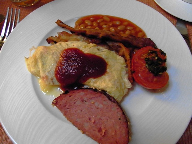 右)最後のひと皿はイングリッシュブレックファスト風に。焼トマトがうまい。