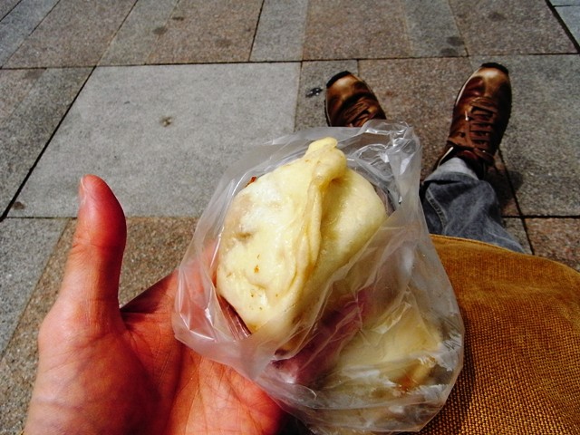 その後、そごう復興館横の「姜太太包子」で肉まん、野菜まん、高菜まん各15元(45円)を。