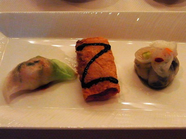 上右)点心3種。とても凝ったつくり。おいしい。それぞれタレが裏側に塗ってある。