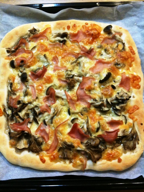 今日はトマトソースを作るのが面倒なので、キノコとハムのピザ。
